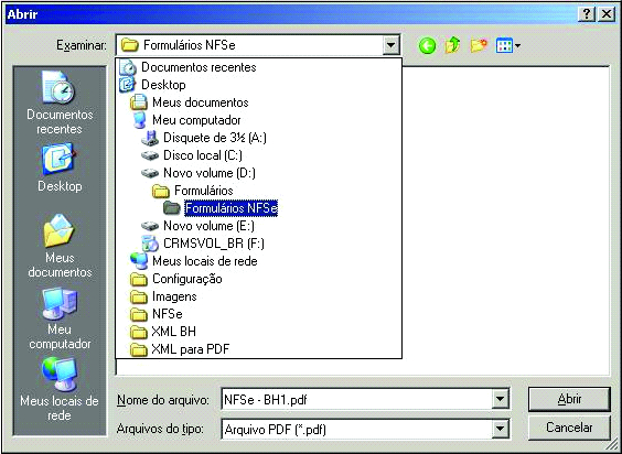 Seleção do arquivo PDF do Documento Formulário filho da Impressão NFS-e