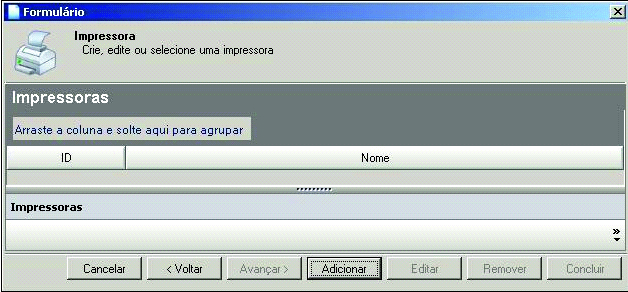 Passo 12: Ao preencher todos os campos solicitados, clique no botão Avançar que será habilitado. Na tela Impressoras, mostrada abaixo, se não conter nenhuma impressora cadastrada clique no botão Adicionar para abrir o Assistente de Impressora. No assistente clique no botão Avançar para prosseguir com a configuração. Se existir uma impressora cadastrada selecione e clique no botão Avançar.