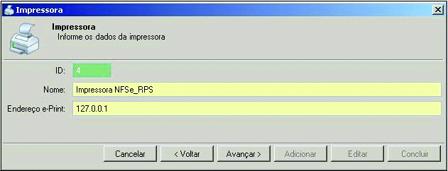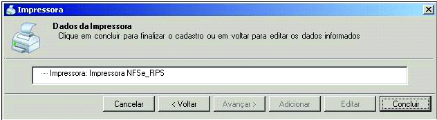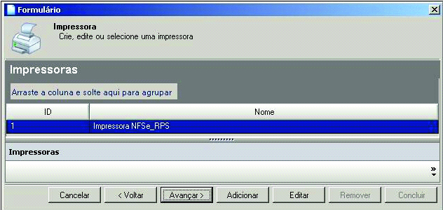 Passo 16: Clique no botão Concluir para confirmar o cadastro da Impressora. A tela abaixo será exibida, então selecione a impressora cadastrada e clique no botão Avançar para prosseguir com a configuração. Seleção da Impressora cadastrada
