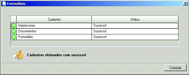 Tela de conclusão do cadastro de Impressoras, Documento e Formulários. |
