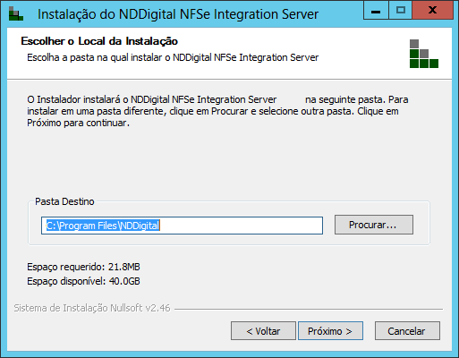 Passo 2: Será exibido o local de instalação do NFS-e Integration Server, clique em Próximo para continuar.