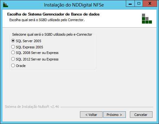 Passo 2: Seleção do Banco de Dados: Disponibiliza as opções de instalação do módulo NDDigital NFS-e Connector utilizando o Sistema Gerenciador de Banco de Dados MSSQL Server 2005 ou Express Edition, MSSQL Server 2008 ou Express Edition e Oracle 10g ou superior. Nesta demonstração, o aplicativo será instalado com banco de dados SQL 2012 Server. Para prosseguir, clique em