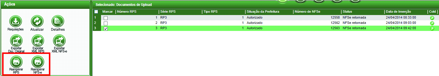 Passo 3: Após marcar um documento, os botões Reimprimir RPS e Reimprimir NFS-e serão exibidos. O botão Reimprimir NFS-e só será exibido se o documento marcado já foi autorizado pela Prefeitura. Se desejar imprimir o documento RPS, clique no botão Reimprimir RPS, se desejar imprimir o documento NFS-e, clique no botão Reimprimir NFS-e.