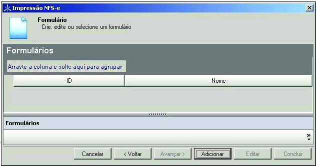 Passo 6: Ao clicar no botão Avançar, será exibida a tela Formulários, clique no botão Adicionar para abrir a tela do Assistente de Formulário, e nesta tela clique no botão Avançar para prosseguir com a configuração.
