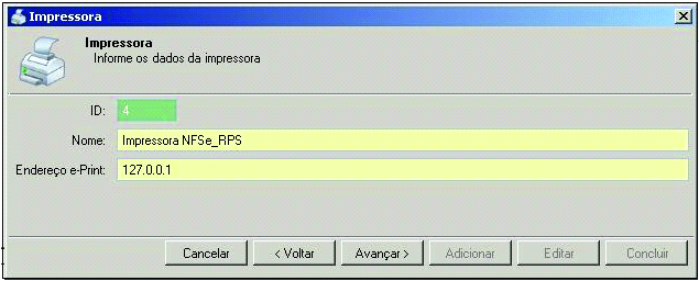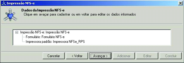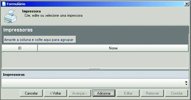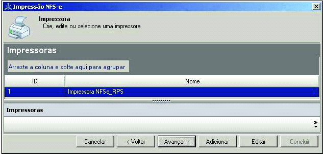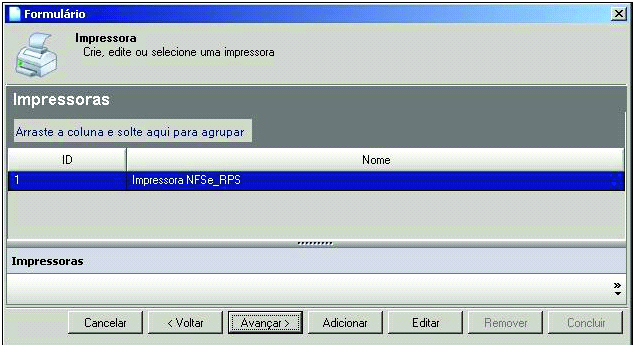 Passo 32: A tela Impressoras será exibida, selecione uma impressora já cadastrada e clique no botão Avançar. Seleção da Impressora para o Formulário filho NFS-e