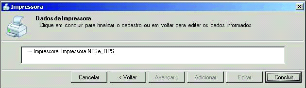 Passo 21: Clique no botão Concluir para confirmar o cadastro da impressora. A tela abaixo será exibida, então selecione a impressora cadastrada e clique no botão Avançar para prosseguir com a configuração.