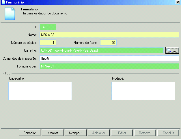 Passo 28: O campo Rodapé é utilizado para informar os comandos PJL da impressora para rodapé de página. Informando os dados do Documento do Formulário filho da Impressão NFS-e