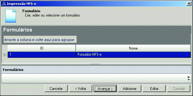 Passo 31: A tela Formulários será exibida, selecione o Formulário NFS-e cadastrado e clique no botão Avançar.