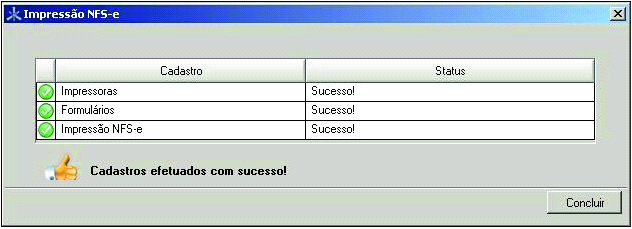 Passo 34: Uma tela será exibida com a mensagem Cadastros efetuados com sucesso!, clique no botão Avançar para confirmar os dados informados. Tela de conclusão do cadastro de Impressoras, Formulários e Impressão NFS-e |