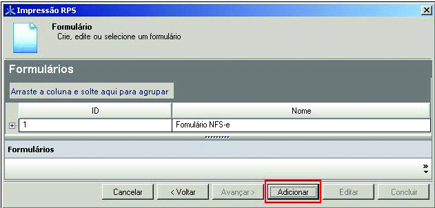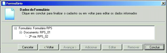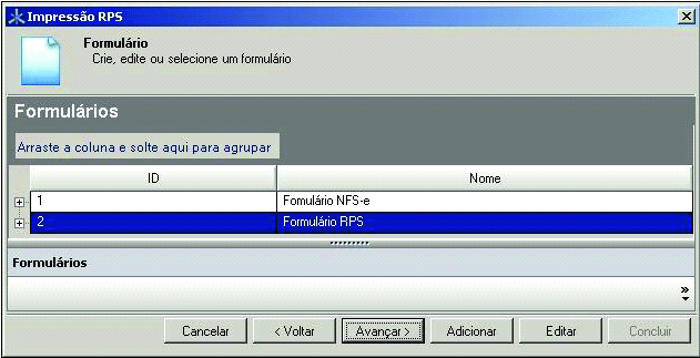 Passo 28: A tela Formulários será exibida, selecione o Formulário RPS cadastrado e clique no botão Avançar.