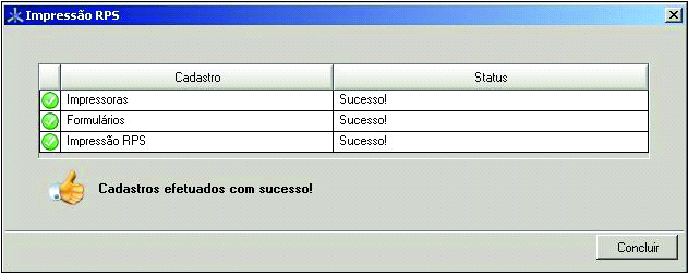 Tela de conclusão do cadastro de Impressoras, Formulários e Impressão RPS |