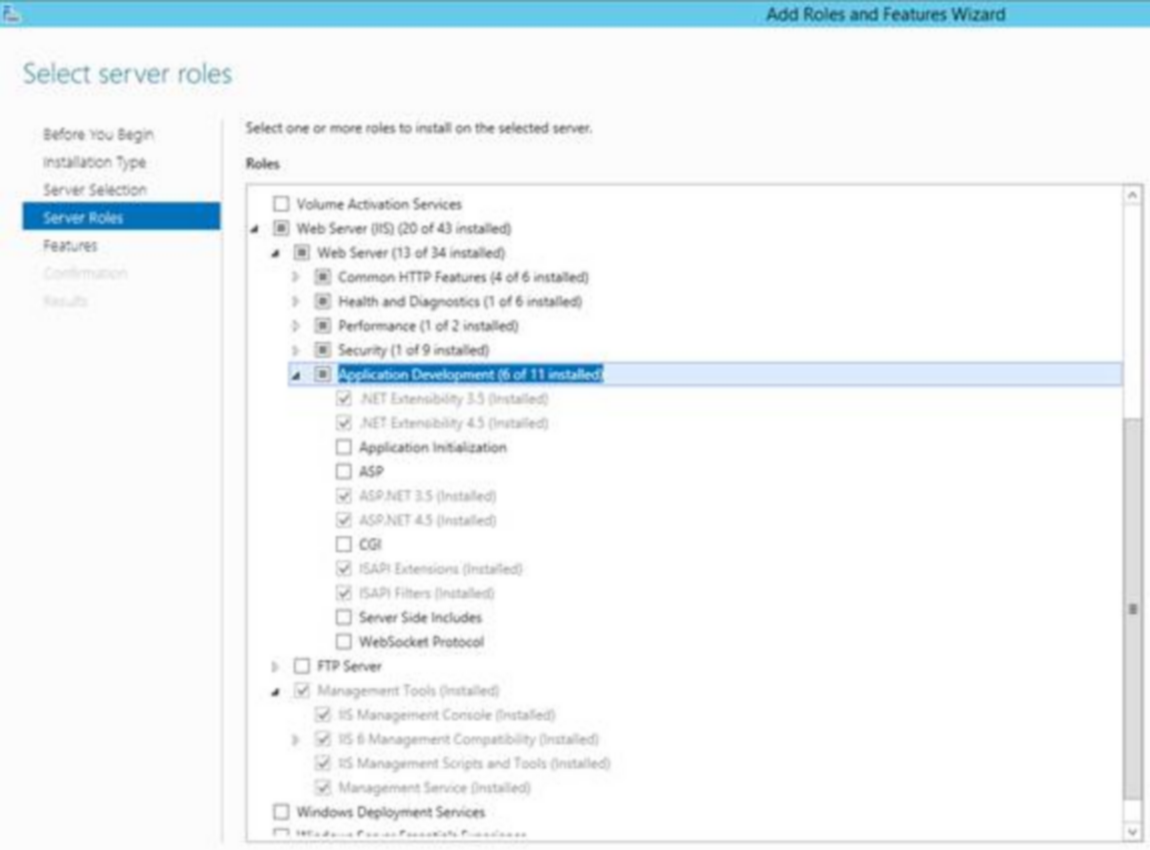 Para a solução dos problemas acima deve se verificar se os seguintes recursos estão instalados corretamente no servidor. Acessar: Gerenciamento de Servidor >>>> Manage >>>> Add Roles and Features Wizard. Verificar se o: · Servidor Web IIS está habilitado e se a Compatibilidade de gerenciamento do IIS 6, está habilitada; Como o server 2012 vem nativo o Framework 4.5 deverá ser habilitado o mesmo e também o Framework 3.5. · Em desenvolvimento de aplicativo deverá verificar se a opção: ASP.NET 3.5 e 4.5, está habilitada e seus serviços estão habilitados;