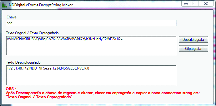 DATABASE: Deverá ser descriptografada utilizando a ferramenta de descriptografia do Maker. E alterado o valor: O valor descriptografado é assim, sem a instância: localhost;NDD_NFSe;sa;1234;;0 Quando alterado o valor deverá ficar assim com instância: localhost;NDD_NFSe;sa;1234;MSSQLSERVER;0 Após alterado o valor , deve ser criptografado utilizando a ferramenta e alterado na tabela.
