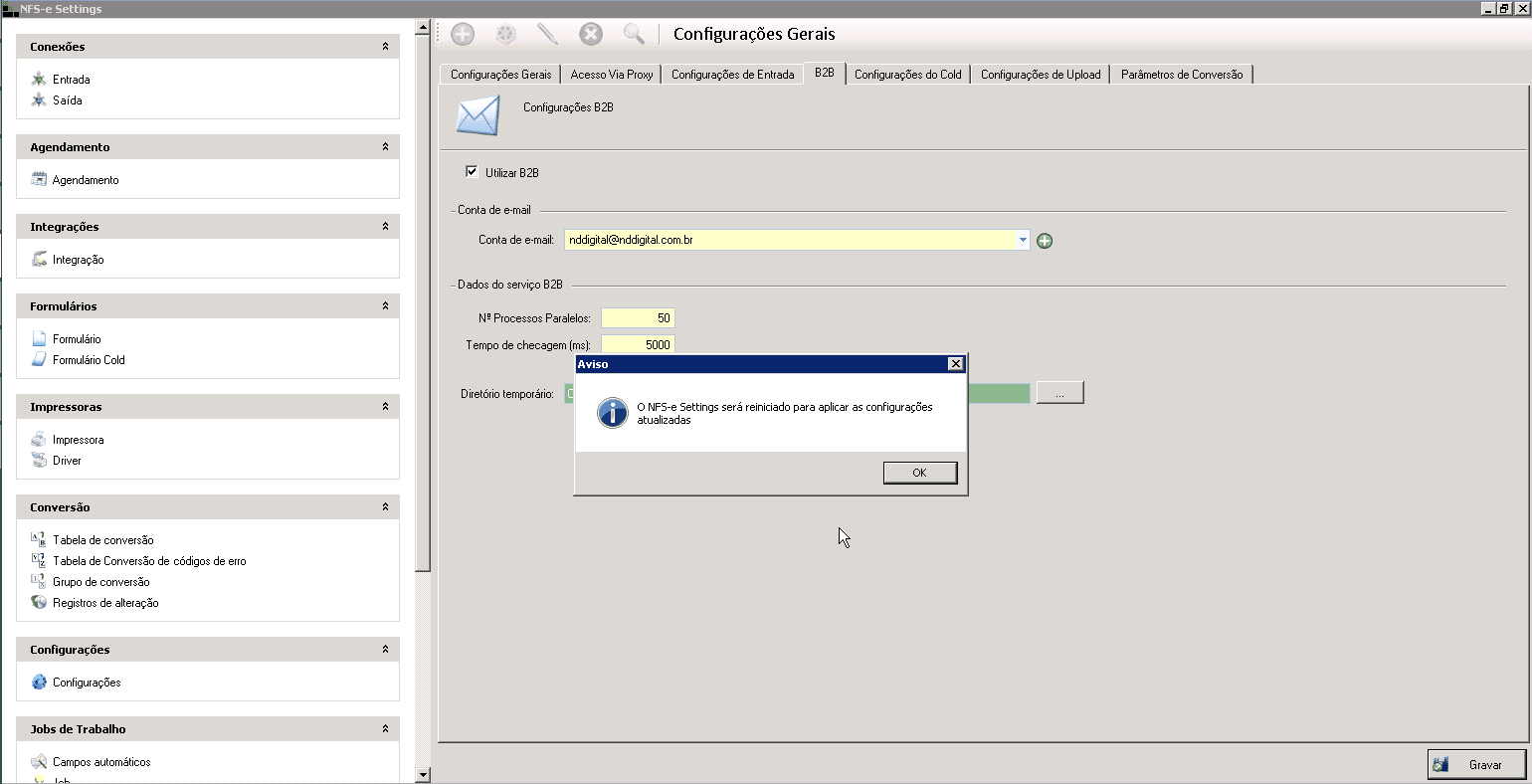 Passo 7: Após preencher todos os campos e clicar no botão Gravar, será exibida uma mensagem de aviso alertando que o NFS-e Settings será reiniciado para aplicar as configurações atualizadas, clique em OK e o NFS-e Settings será reiniciado voltando com todas as opções de B2B habilitadas.