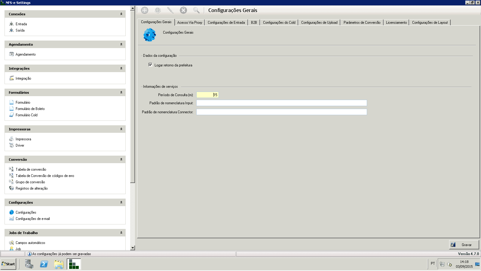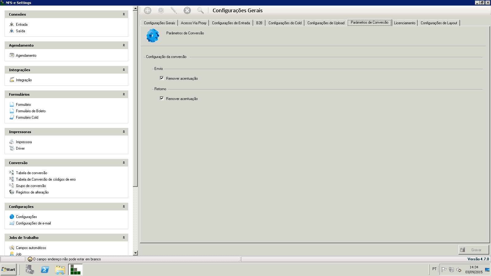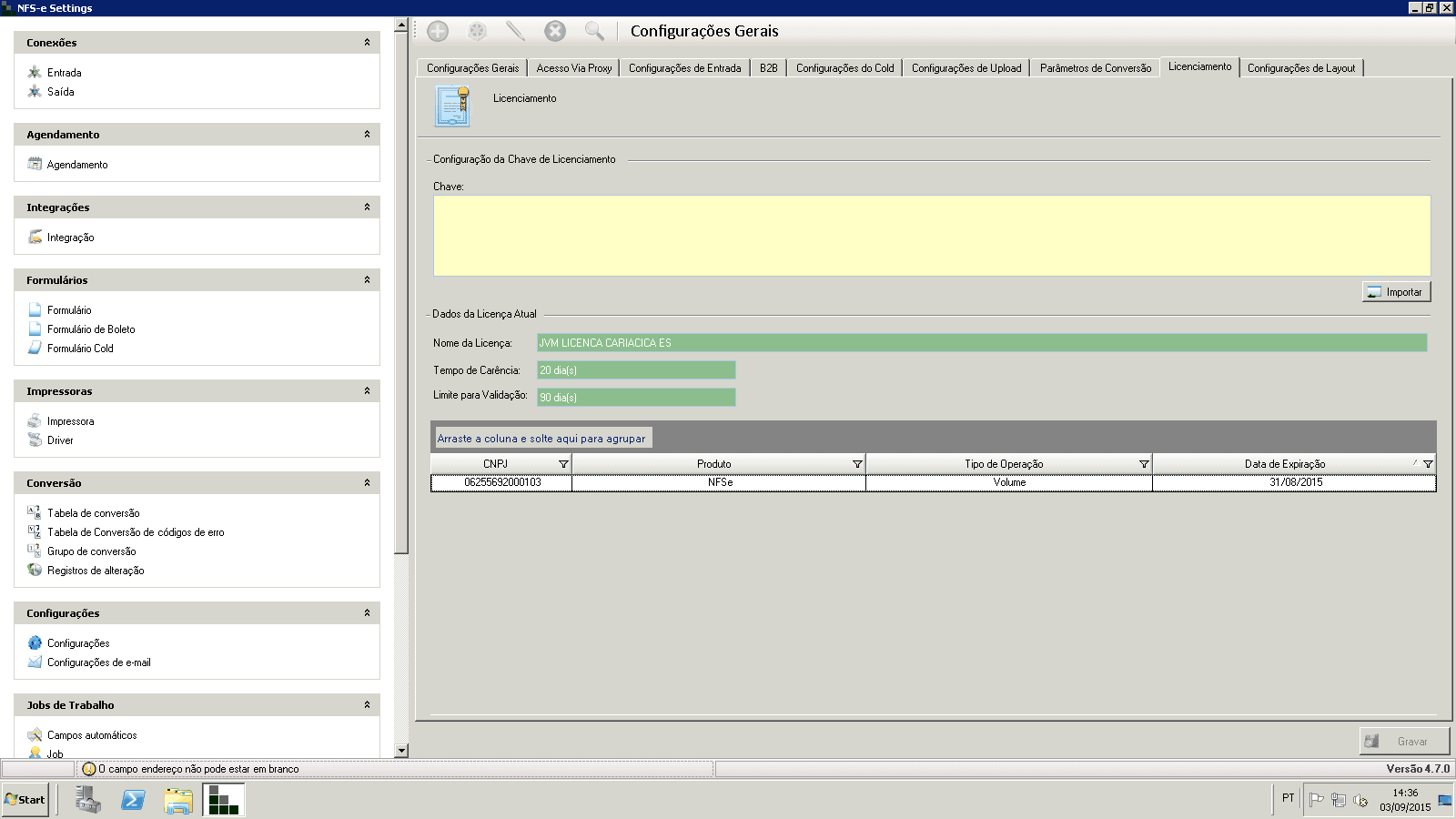 Para confirmar as seleções clique no botão Gravar. Aba das Configurações de Parâmentros de Conversão. Passo 21: Configurações de Licenciamento: •No campo Chave insira a licença do produto. •No campo Tempo Carência deverá ser apresentado quanto tempo a chave possuí de carência após seu vencimento. •No campo Limite Validação deverá ser apresentado o tempo limite para envio de estatísticas para NDDigital.