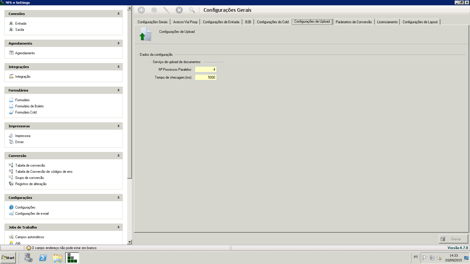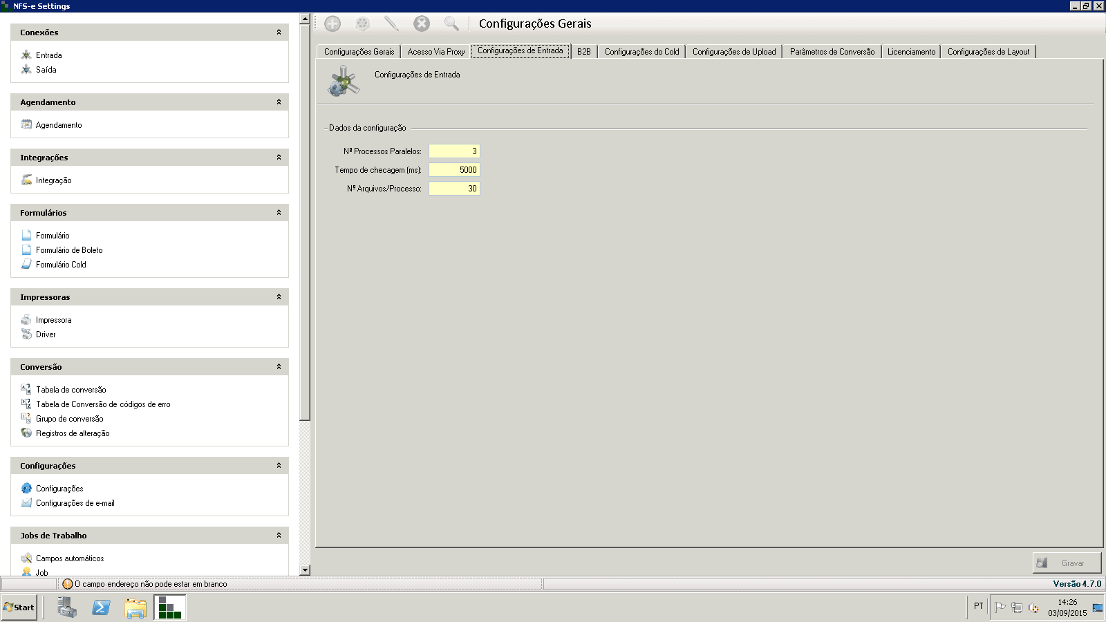 •Campo Nº Processos Paralelos: Utilizado para informar ao serviço do Input, qual é o máximo de processos simultâneos que ele pode realizar; •Campo Tempo de checagem (ms): Utilizado para informar ao serviço do Input qual é o intervalo de tempo que ele irá buscar os arquivos no diretório;
