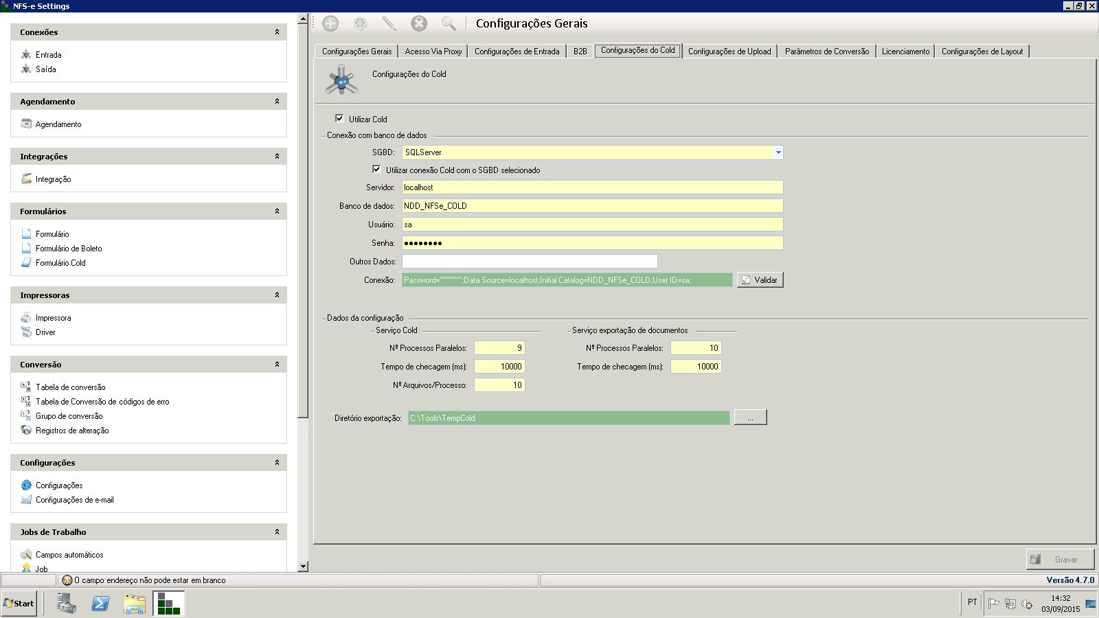 Passo 9: A aba Configurações do Cold é utilizada para habilitar e informar as credenciais de acesso ao banco de dados do NFS-e Cold.