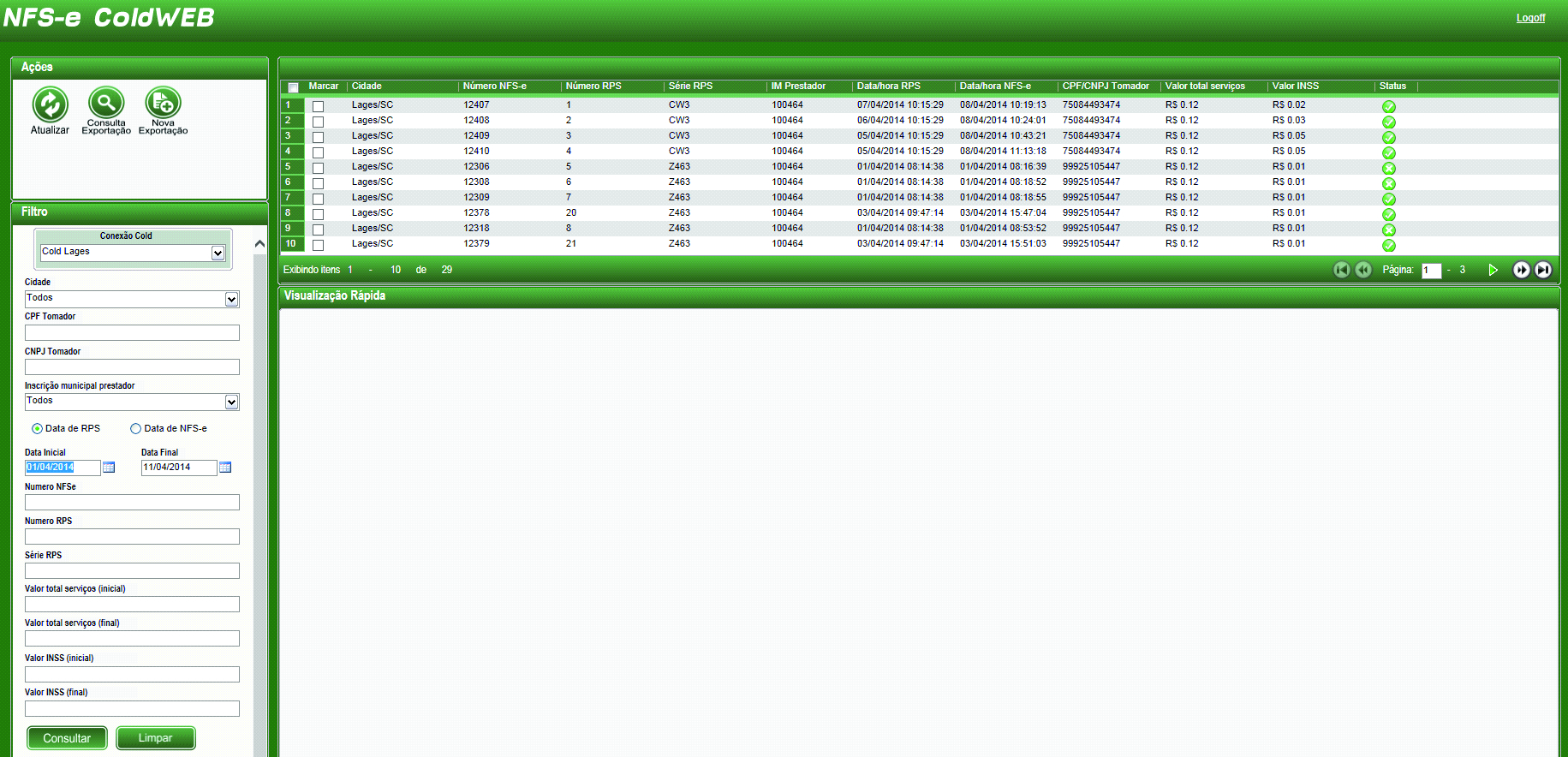 Para efetuar uma consulta selecione uma Conexão Cold, uma Cidade e uma Inscrição municipal prestador e clique em Consultar.
