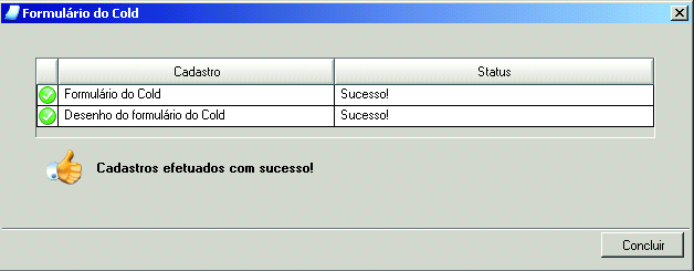 Passo 10: É exibida uma tela com o resumo dos cadastros realizados clique no botão Avançar e em seguida em Concluir para confirmar o cadastro do formulário Cold.