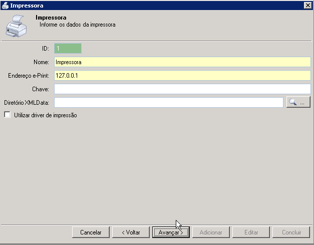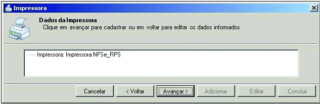 Passo 8: Na tela Dados da impressora, mostrada abaixo, confira os dados da impressora cadastrada e clique no botão Avançar. A tela seguinte exibirá uma mensagem informando que os cadastros foram efetuados com sucesso, basta clicar no botão Concluir para confirmar o cadastro da impressora.