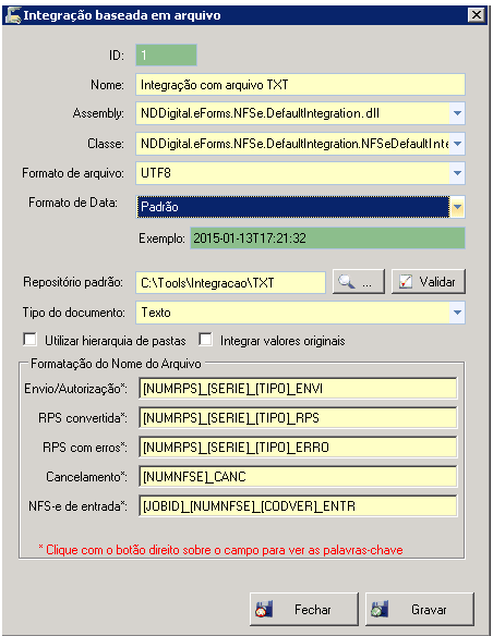 Passo 12: O campo Formatação do Campo do Arquivo, é utilizado para formatar o nome do arquivo de integração via arquivo TXT ou XML. Será possível customizar as integrações de Envio/Autorização, RPS Convertida, RPS com Erros, Cancelamento e NFS-e de Entrada. Para visualizar as variáveis disponíveis para customizar a nomenclatura do arquivo de integração clique com o botão direito do mouse dentro da caixa desejada e será apresentada uma lista com os campos disponíveis para integração para cada campo.