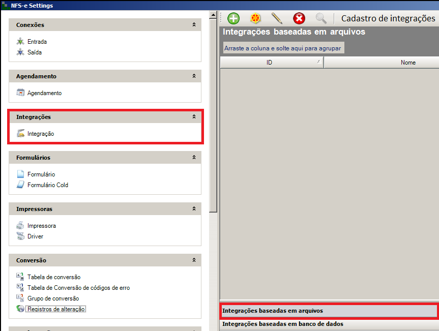 Interface do NFS-e Settings Passo 2: A tela abaixo será exibida: Tela de cadastro de integração baseada em arquivos