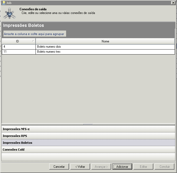 Passo 38: Após clicar em Impressão Boletos, selecione uma Impressão Boletos cadastrada e clique no botão Avançar. Se não existir uma Impressão Boletos cadastrada, clique no botão Adicionar. Se desejar alterar alguma informação da Impressão Boleto existente, clique no botão Editar. Caso deseje cadastrar a Impressão de RPS siga os passos no link: RPS Conexões de Saída Impressões Boleto.