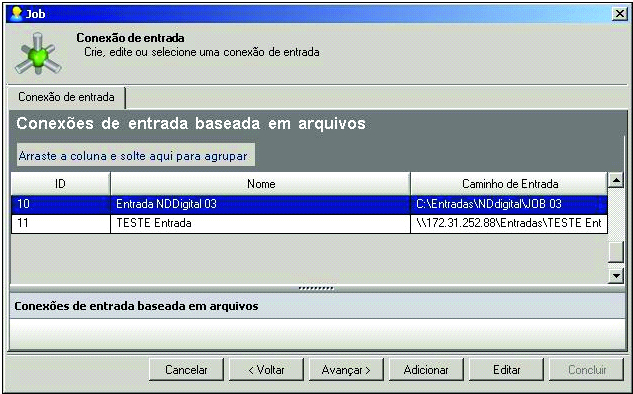 Passo 35: Na tela que é exibida, selecione a conexão de Entrada Baseada em arquivo cadastrada e clique no botão Avançar. Se não existir nenhuma conexão de entrada cadastrada, clique no botão Adicionar para incluir uma conexão de entrada. Caso deseje editar o nome ou caminho do diretório da conexão de entrada baseada em arquivos, clique no botão Editar. Caso deseje cadastrar a conexão de entrada siga os passos no link: Conexões de Entrada