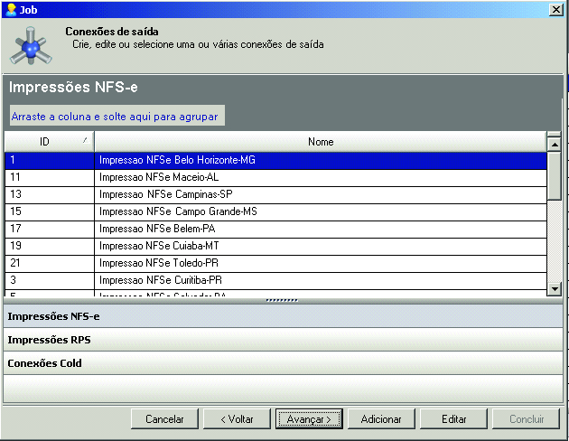 Passo 36: Após clicar em Impressões NFS-e, selecione uma Impressão NFS-e cadastrada e clique no botão Avançar. Se não existir nenhuma Impressão NFS-e cadastrada, clique no botão Adicionar para incluir. Se desejar alterar alguma informação da Impressão NFS-e existente, clique no botão Editar. Caso deseje cadastrar a Impressão de NFS-e siga os passos no link: Conexões de Saída Impressões NFS-e