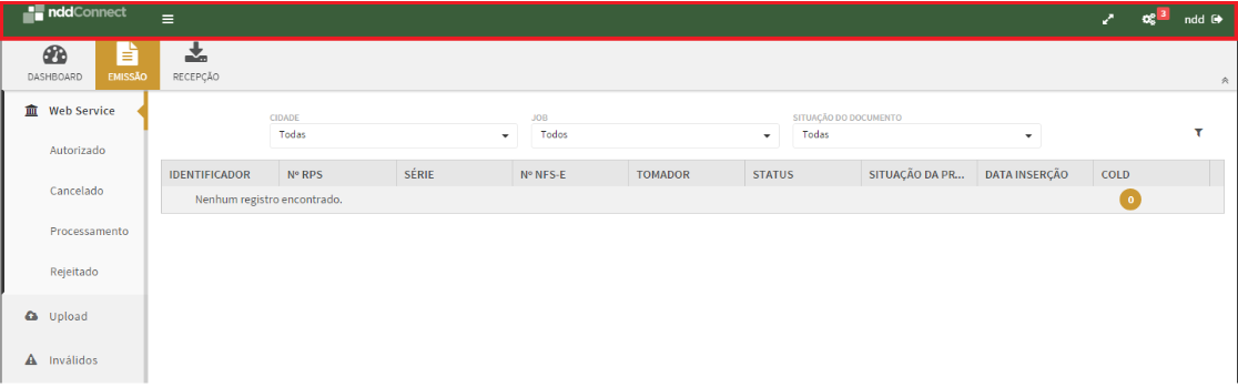 •Quando o usuário encontra-se nas abas de Emissão e Recepção é possível "Minimizar ou Maximizar" a barra lateral esquerdo, para isso clique no ícone em destaque na imagem abaixo.
