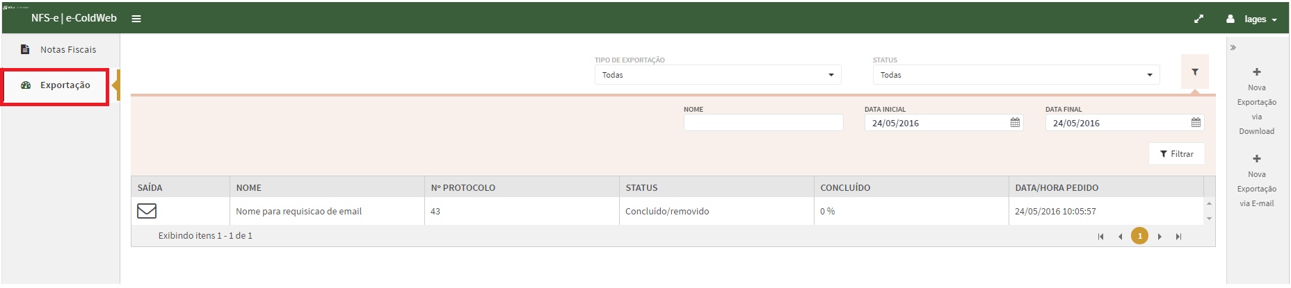 Observação: Só serão apresentados os documentos desejados na página de Exportação, na aba Notas fiscais, se for realizada uma pesquisa primeiro na aba Notas Fiscais: Aba Notas Fiscais |