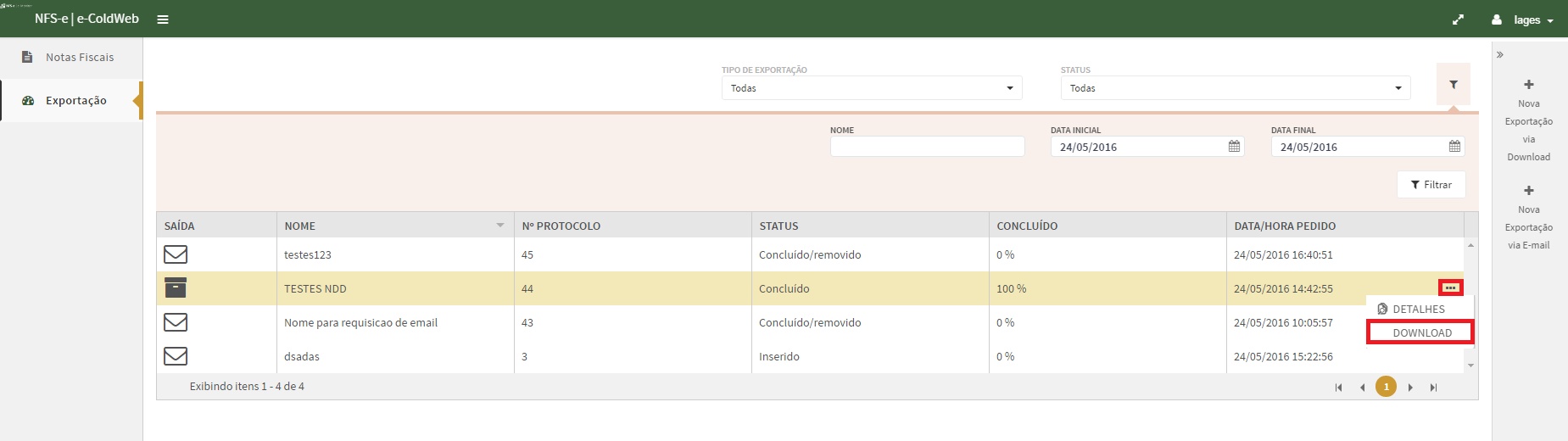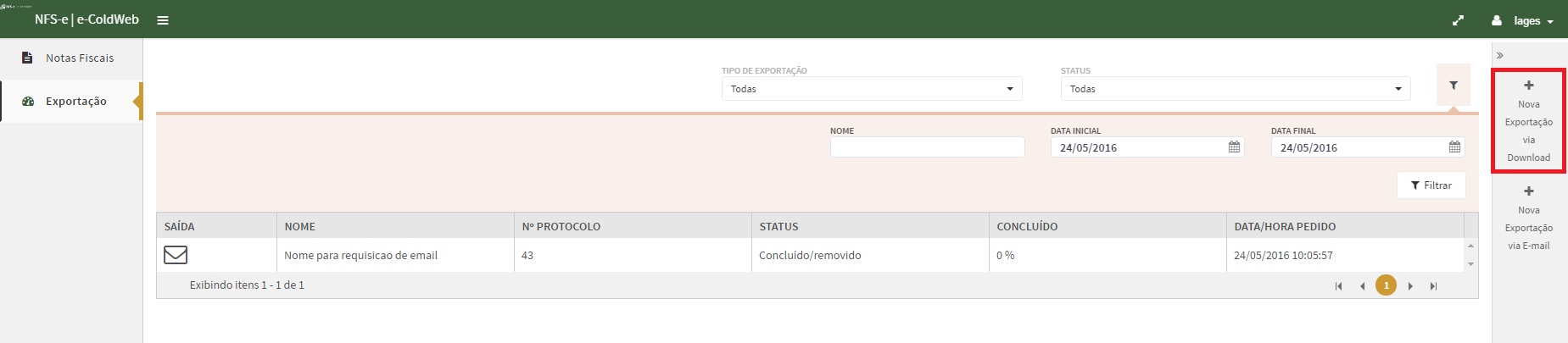 Para realizar uma Nova Exportação via download, clique no ícone selecionado abaixo: