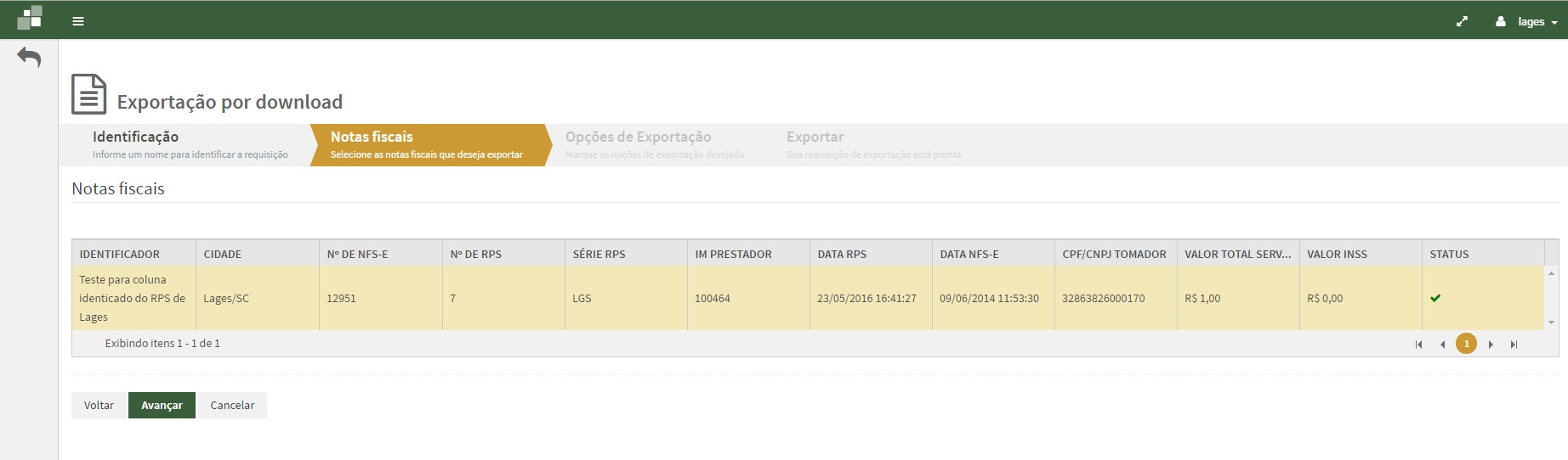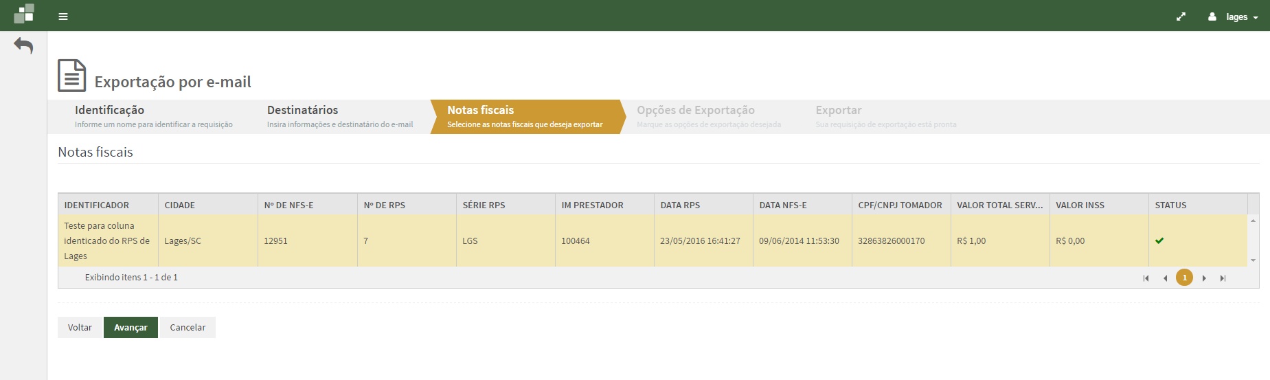Na aba Notas fiscais selecione os documentos desejados e clique no botão Avançar.