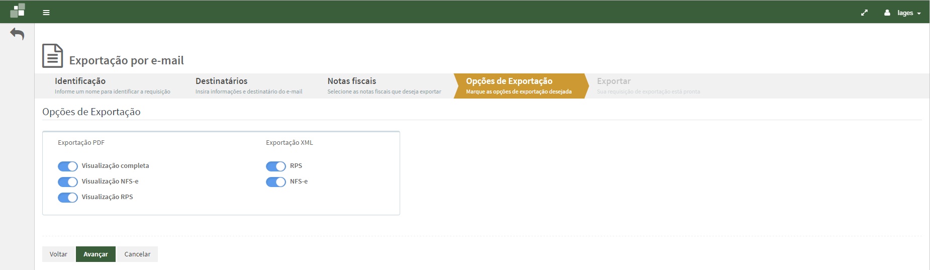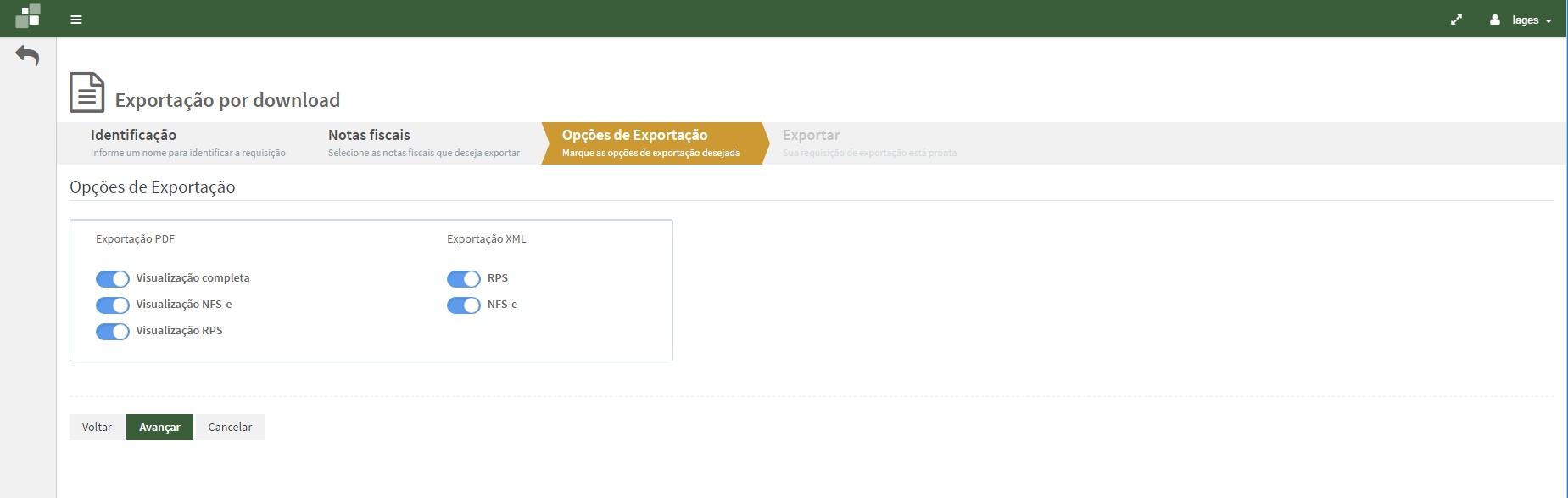 Na aba Opções de exportação selecione as exportações que deseja realizar e clique no botão Avançar.