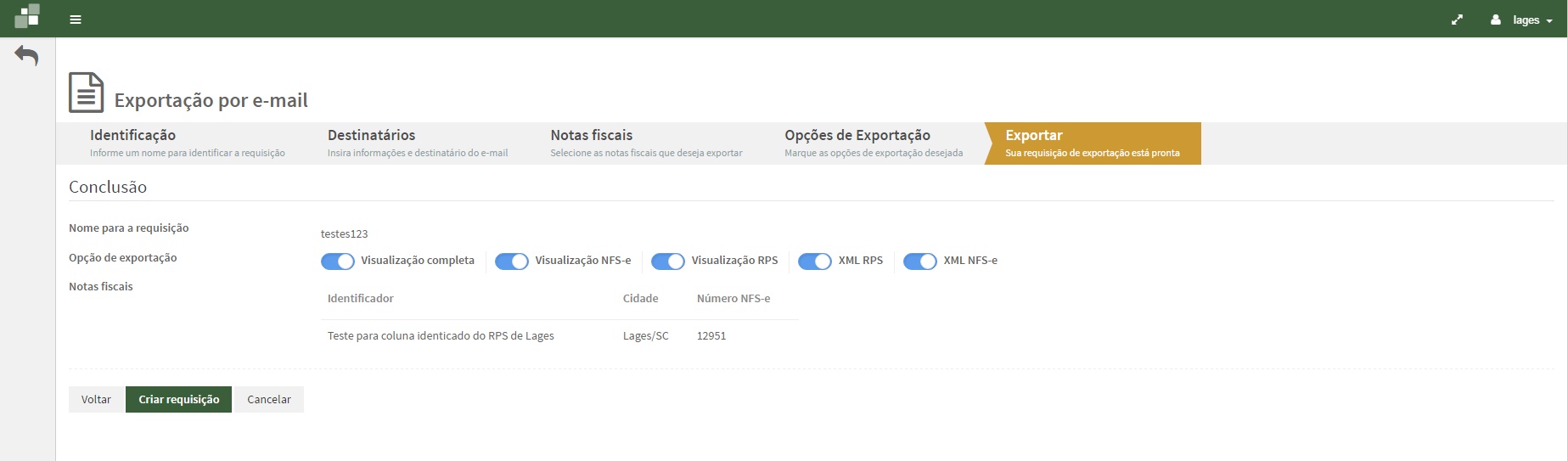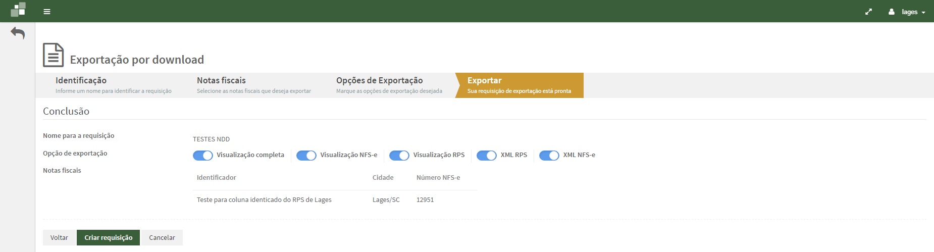 Na aba Exportar verifique as informações do documento que será exportado e clique no botão Criar requisição.