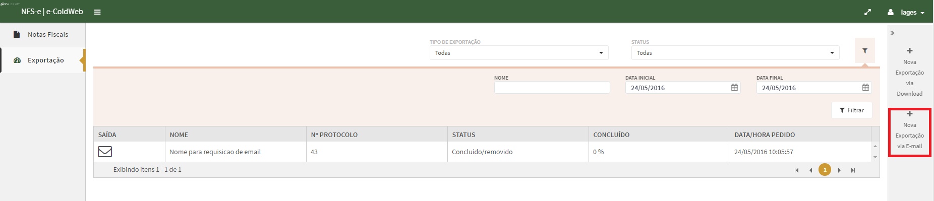 Para realizar uma Nova Exportação via e-Mail, clique no ícone selecionado abaixo: