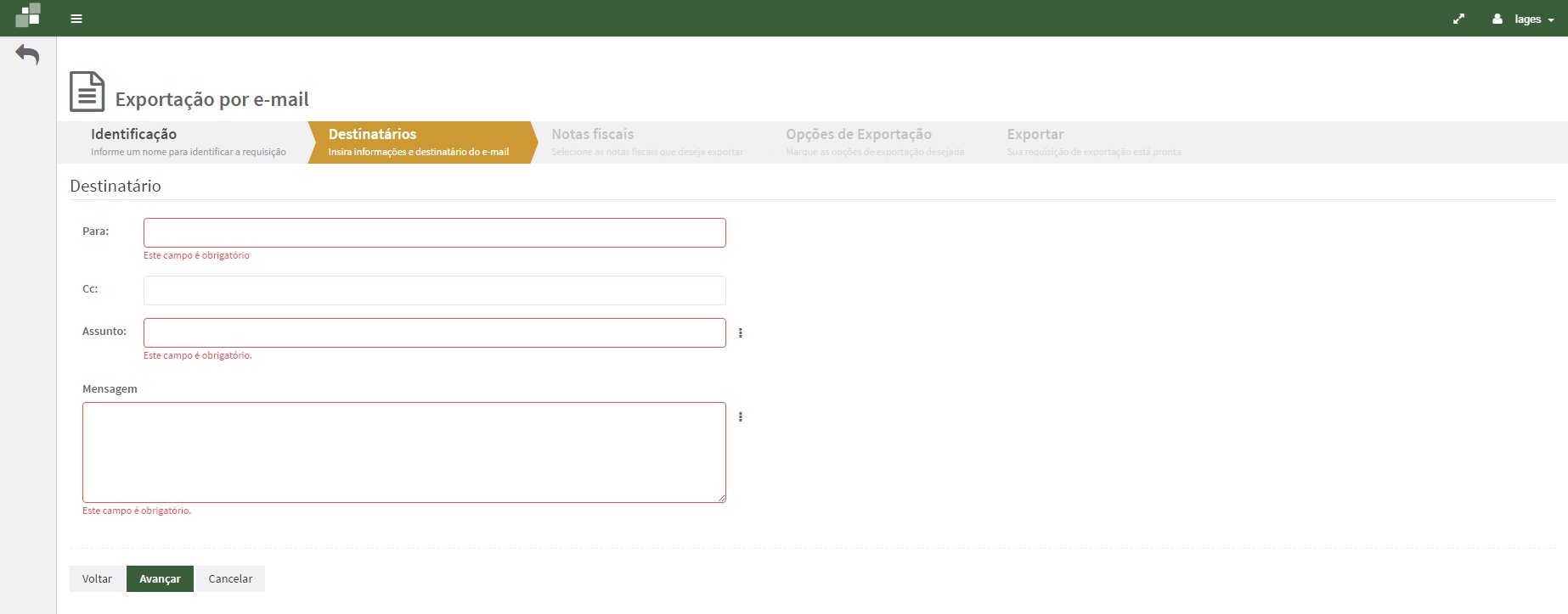 Na aba Destinatários informe as informações desejadas e clique no botão Avançar.