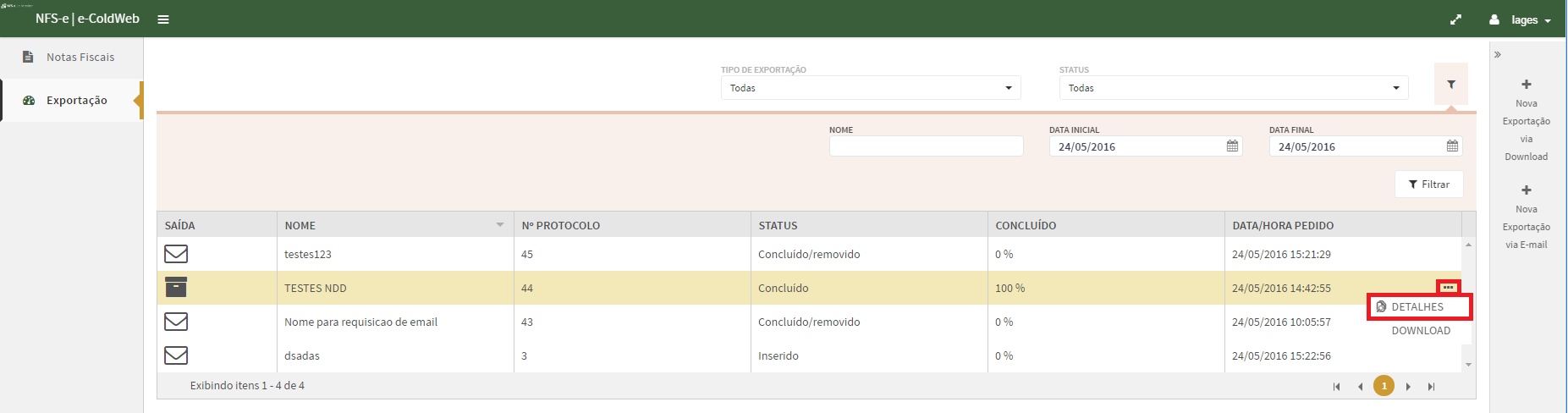 Após realizar as exportações é possível visualizar os detalhes do documento, para isso basta selecionar um registro no grid e clicar sobre (...), em seguida clique em Detalhes.