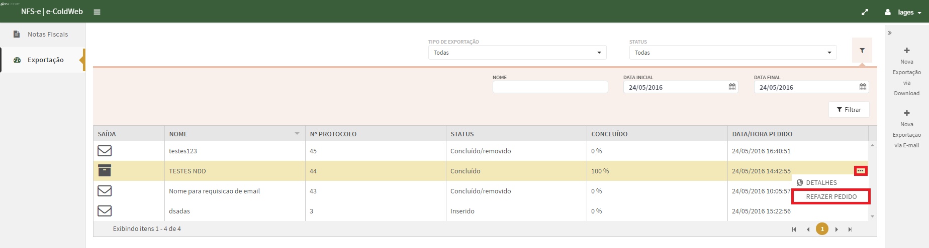 Para solicitar refazer pedido do documento basta selecionar um registro no grid e clicar sobre (...), em seguida clique em Refazer Pedido.