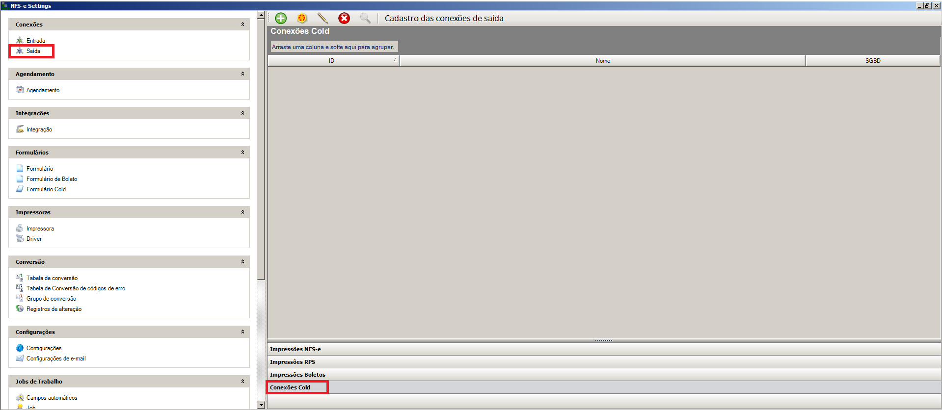 Passo 1: Clique na aba Conexões > Saída, localizada no menu à esquerda da interface do NFS-e Settings e em seguida na opção Conexões Cold localizada na parte inferior da interface do NFS-e Settings.