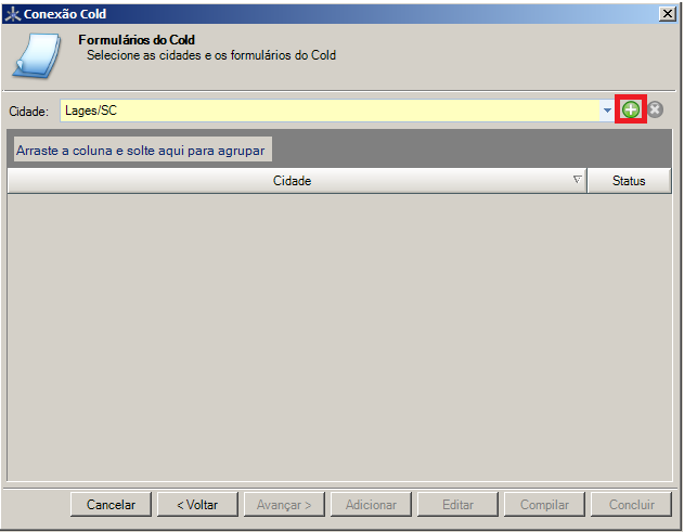Passo 5: Na tela de seleção de cidades e formulários Cold, no campo Cidade, selecione a cidade que será configurada e clique no botão Adicionar, localizado do lado direito do campo Cidade.