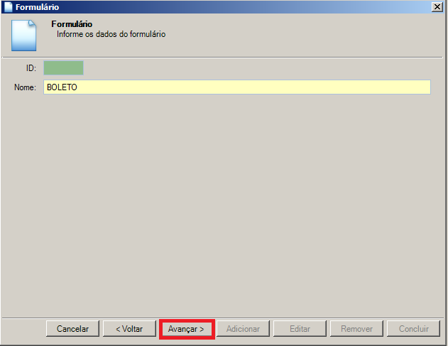 Passo 6: Na tela Formulário que é exibida, informe o nome do formulário no campo Nome. Após informar o nome, clique no botão Avançar que logo será habilitado.