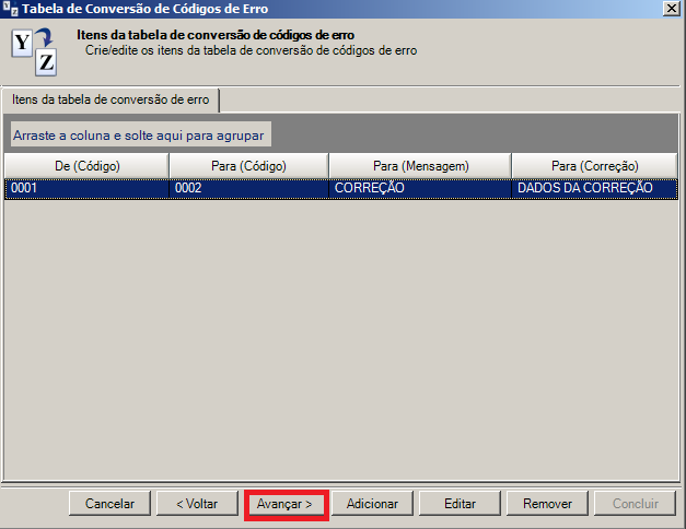Passo 5: Será apresentado a tela itens da tabela de conversão de código de erro, siga as configurações abaixo: