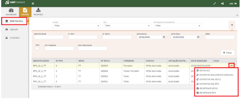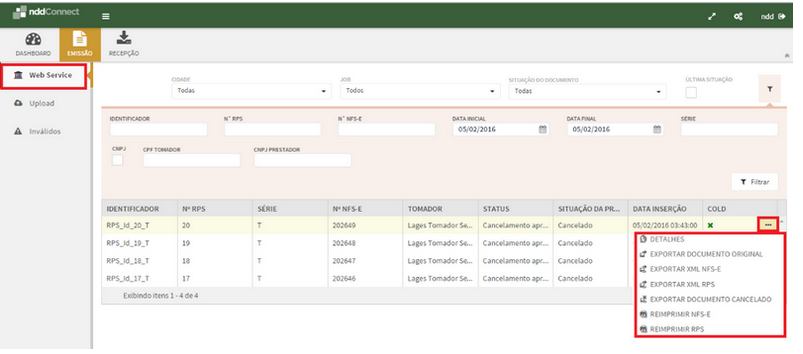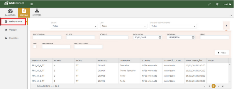 A aba de Web Service é utilizada para visualização de documentos autorizados, cancelados, em processamento e rejeitados, processados via webservice.