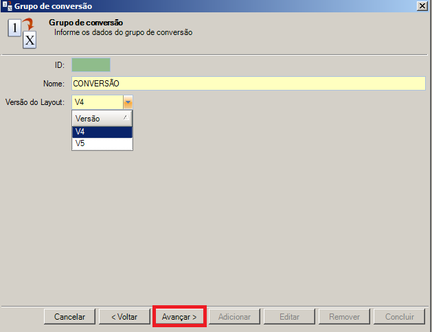 B.No campo Versão do Layout, selecione a versão do layout a ser utilizado no grupo de conversão, e clique em Avançar.