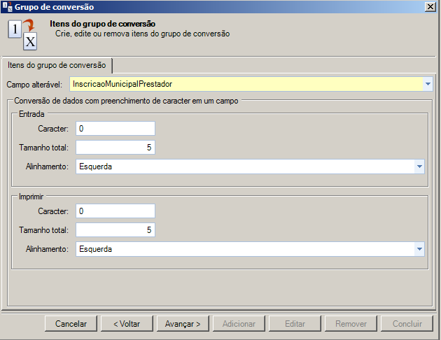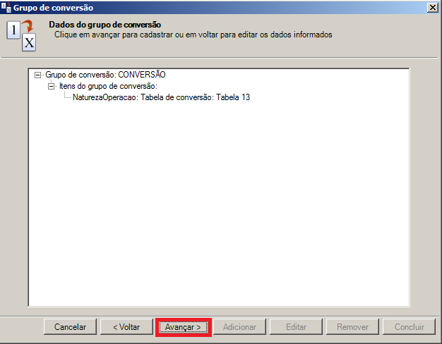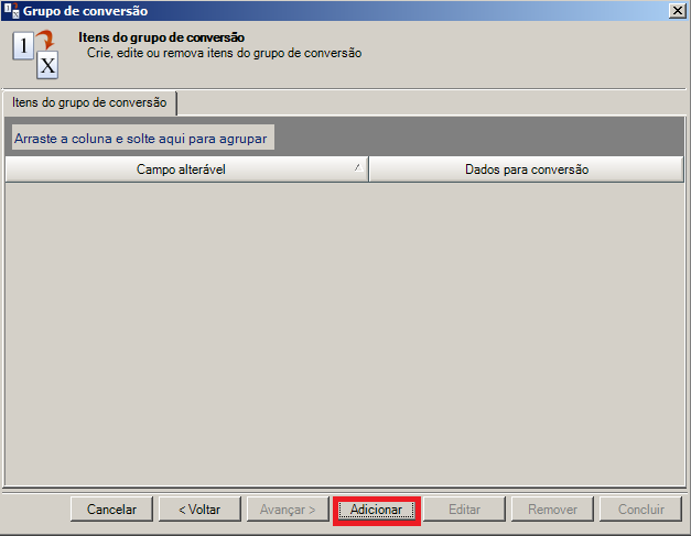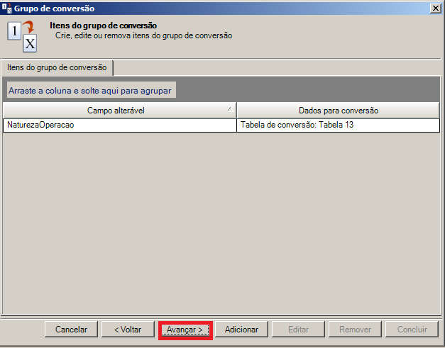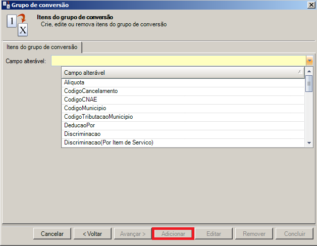 Passo 5: Será exibida a tela Itens do Grupo de Conversão. Selecione um Campo Alterável para ser cadastrado no grupo de conversão, após isto clique no botão Avançar.
