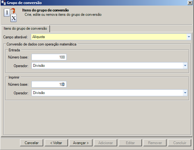 Observação: O campo alíquota é utilizado para fazer uma conversão de números inteiros para decimais, ou vice-versa. |