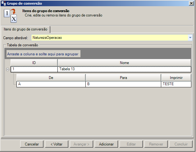 Os campos NaturezaOperacao(Grupo) e RegimeEspecialTributacao(Grupo) são utilizados para efetuar a concatenação entre os valores informados nas expressões do grupo de conversão.
