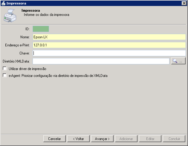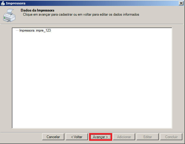 Passo 4: Na tela Dados da impressora, mostrada abaixo, confira os dados da impressora cadastrada e clique no botão Avançar.
