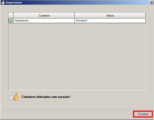 Passo 5: A tela seguinte exibirá uma mensagem informando que os cadastros foram efetuados com sucesso, basta clicar no botão Concluir para confirmar o cadastro da impressora.